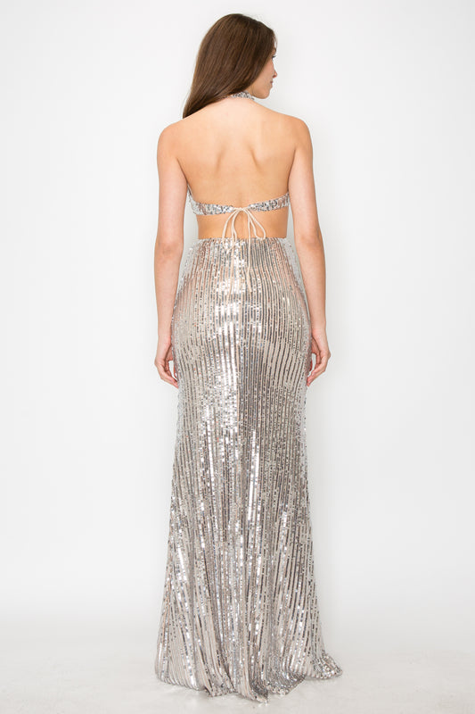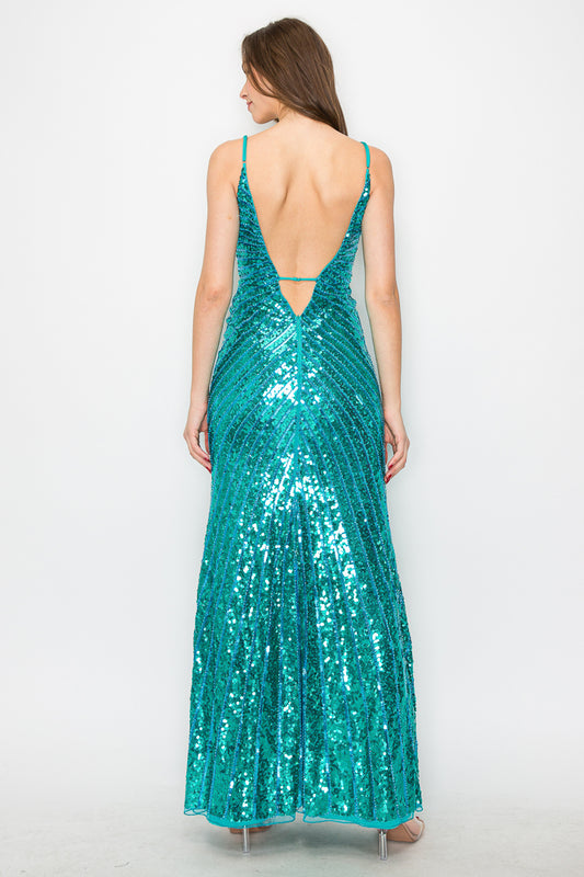 Kiara Rhinestone Strap Sequin Gown with Slit